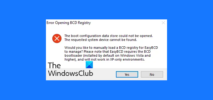 BCDoDatos de configuración de arranqueLos archivos contienen instrucciones que Windows necesita para iniciarse correctamente. Si tiene problemas para iniciar su computadora, lo más probable es que se deba a una mala configuración o incluso a que esté dañado.archivos. Si mientras ejecuta cualquier comando en bcedit.exe, recibe el mensaje:No se pudo abrir el almacén de datos de configuración de arranque, entonces aquí se explica cómo solucionarlo.