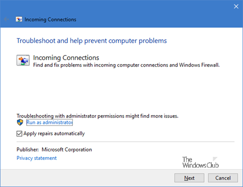 El solucionador de problemas de conexiones entrantes lo ayudará a encontrar y solucionar problemas con las conexiones entrantes y el Firewall de Windows. Básicamente, soluciona problemas al permitir que otras computadoras se comuniquen con la computadora de destino a través del Firewall de Windows. Para iniciarlo, abra el cuadro Ejecutar y ejecute lo siguiente: