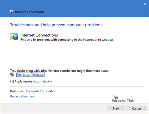 Ejecute el Solucionador de problemas de conexiones a Internet si descubre que no puede conectarse a Internet o tiene problemas para abrir un sitio web. Este solucionador de problemas solucionará los problemas automáticamente. Para que aparezca, ejecute: