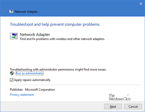 Si tiene problemas con sus adaptadores Ethernet, inalámbricos y de otra red, debe ejecutar el Solucionador de problemas del adaptador de red. Para abrirlo directamente, desde el menú WinX, abra el cuadro Ejecutar y ejecute el siguiente comando: