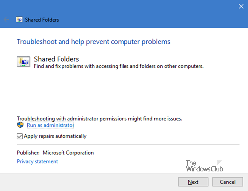 Si tiene problemas para acceder a archivos y carpetas en otras computadoras con Windows, puede ejecutar el Solucionador de problemas de carpetas compartidas. Para abrirlo directamente, desde el menú WinX, abra el cuadro Ejecutar y ejecute el siguiente comando: