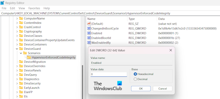 HKEY_LOCAL_MACHINE\SYSTEM\CurrentControlSet\Control\DeviceGuard\Scenarios\HypervisorEnforcedCodeIntegrity