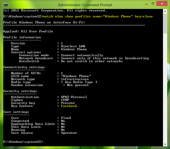2.Si lo desea, puede usar el siguiente comando para mostrar las propiedades de esa red inalámbrica específica para la cual está actualizando la clave de seguridad: