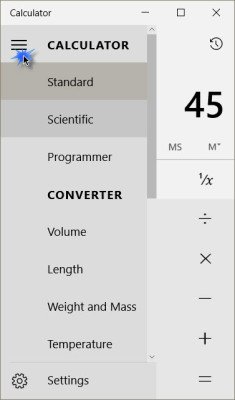 Las características son casi similares a las del anterior. Puede usarlo en diferentes modos como Calculadora estándar, Calculadora científica, Programador y Convertidor. Simplemente haga clic en el menú Hamburguesa en la esquina superior izquierda y podrá ver los modos en un menú desplegable.