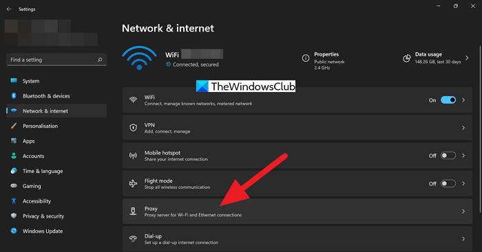 Para eliminar proxies en los navegadores, abra Configuración de su PC usando el teclado Win+I y seleccione la opción Red e Internet en el panel del lado izquierdo. Luego, haga clic en la pestaña Proxy.
