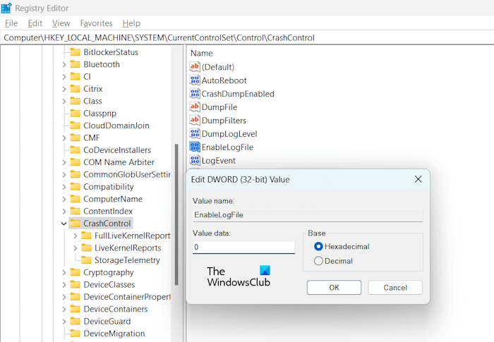 Asegúrese de que elControl de choquesLa tecla está seleccionada en el lado izquierdo. busca elHabilitar archivo de registroentrada por el lado derecho. Una vez que lo encuentre, haga doble clic en él y cambie sus datos de valor a0. Haga clic en Aceptar para guardar los cambios. Reinicie su computadora para que los cambios surtan efecto.