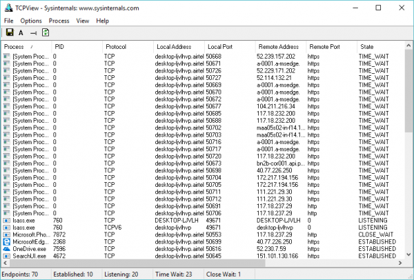 Si no comprende el resultado en los dos primeros casos mencionados anteriormente, puede descargar TCPView desde elsitio web de microsoft. Le muestra una lista detallada de todas las conexiones TCP y UPD. También muestra el estado de las conexiones: si ya hay una conexión establecida, si un componente está esperando una conexión, etc., información.