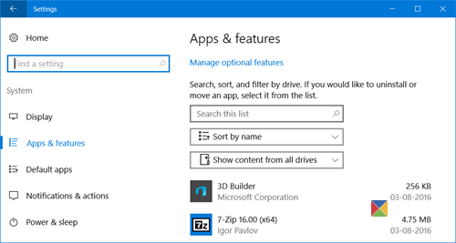 Windows 10 le permite agregar, eliminar o administrar funciones opcionales a través de su Configuración. Para acceder a esta parte, desde el menú WinX, abra Configuración> Sistema y seleccioneAplicaciones y característicasdesde el lado izquierdo.