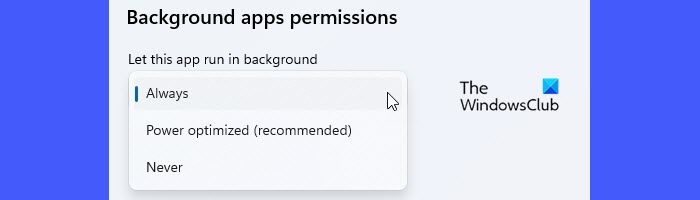 - Cambiar la configuración desplegable paraDeja que esta aplicación se ejecute en segundo plano.aSiempreen Permiso de aplicaciones en segundo plano.