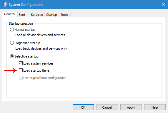 Presione Win + R, escribamsconfigy presione el botón Enter. En la pestaña General, asegúrese de que esté elegida la opción "Inicio selectivo". Luego, desmarque la opción "Cargar elementos de inicio".
