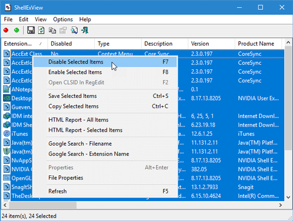 Ahora, selecciona todo y haz clic en el botón rojo. Haga clic derecho en los elementos y opte por "Deshabilitar elementos seleccionados.”