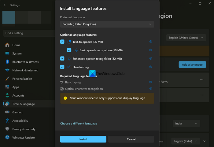 Si su Windows admite solo un idioma, debe actualizarlo a una edición que admita varios idiomas, como Windows 11/10 Home o Pro. También puede evitar la limitación instalando el paquete de idioma manualmente y cambiando el idioma usando el editor del Registro.