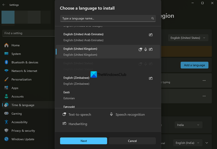 Busque el idioma en el cuadro de entrada de texto Escriba un nombre de idioma o desplácese hacia abajo y seleccione el idioma que desea instalar de la lista. Luego, haga clicPróximo.