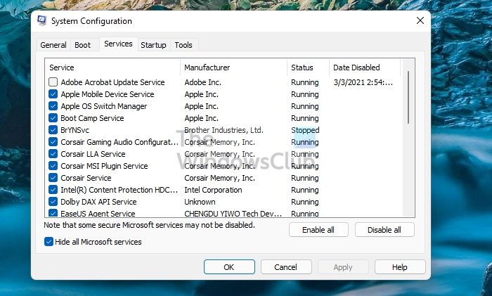- Cambie a Servicios y luego marque la casilla junto a Ocultar todos los servicios de Microsoft