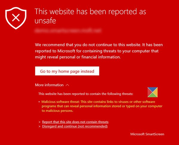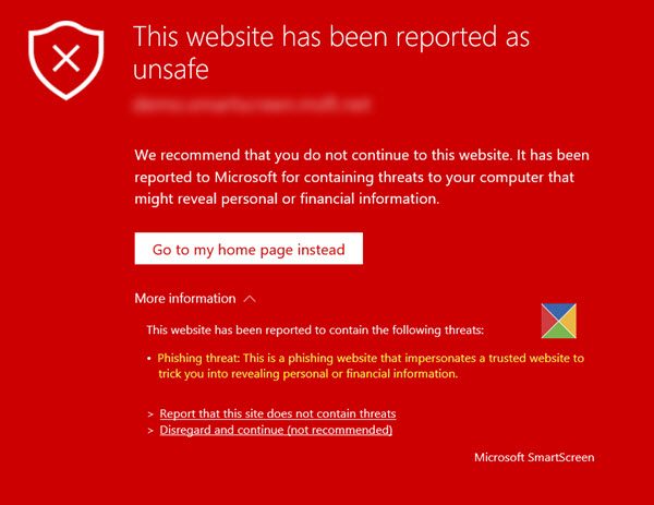 Si SmartScreen está seguro de que el sitio web que está visitando es un sitio, mostrará una pantalla roja conEste sitio web ha sido reportado como no seguro.dirigiéndose con unAmenaza de phishingadvertencia, al hacer clic en elMás informaciónopción. Si encuentra una advertencia de este tipo, cierre la pestaña inmediatamente. Pero si está seguro de que el sitio es seguro, puede hacer clic en elInformar que este sitio no contiene amenazasenlace. Si desea continuar de todos modos, debe hacer clic en elIgnorar y continuarenlace.