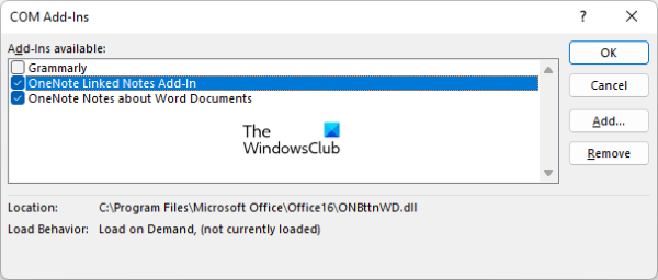 Si el error no ocurre esta vez, la causa de este error es un complemento en conflicto. Ahora, el siguiente paso es encontrar ese complemento problemático. Salga del modo seguro de Word y ejecútelo en modo normal. Abra el documento y vaya aArchivo > Opciones. SeleccionarComplementosdesde el lado izquierdo. Ahora, seleccioneComplementos COMen el menú desplegable del lado derecho y haga clic enIR. Desmarque cualquiera de las casillas de verificación para deshabilitar ese complemento y haga clic en Aceptar. Ahora, exporte el archivo como PDF. Si se produce el error, deshabilite otro complemento y vuelva a intentarlo. Este proceso llevará tiempo, pero podrá identificar el complemento problemático.