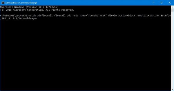 netsh advfirewall firewall add rule name=”YouTubeTweak” dir=in action=block remoteip=173.194.55.0/24,206.111.0.0/16 enable=yes