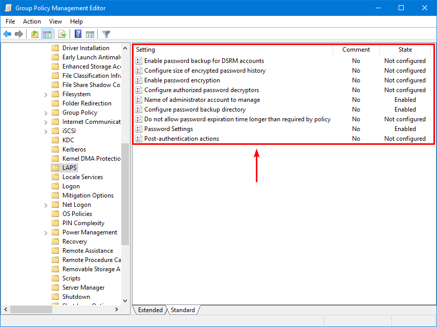 Not:Merkezi Mağazanız varsa Yönetim Şablonları altında LAPS klasörünü göremezsiniz. KopyalaCHILD.admxC:WindowsPolicyDefinitions'tan dosya veCHILD.admlDosyayı C:WindowsPolicyDefinitionsen-US'den Merkezi Mağazanıza kopyalayın. Örneğin, \exoip.localSYSVOLexoip.localPolicies. Bundan sonra LAPS klasörünü göreceksiniz.