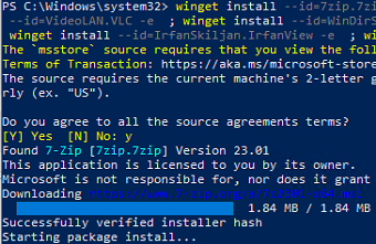 winget install --id=7zip.7zip -e ; winget install --id=Notepad++.Notepad++ -e ; winget install --id=VideoLAN.VLC -e ; winget install --id=WinDirStat.WinDirStat -e ; winget install --id=dotPDNLLC.paintdotnet -e ; winget install --id=IrfanSkiljan.IrfanView -e ; winget install --id=Microsoft.PowerToys -e