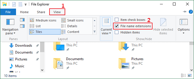 Adım 1: Dosya Gezgini'ne erişin. Geçiş yapGörüşsekmesini açın ve seçeneği etkinleştirinDosya adı uzantıları.