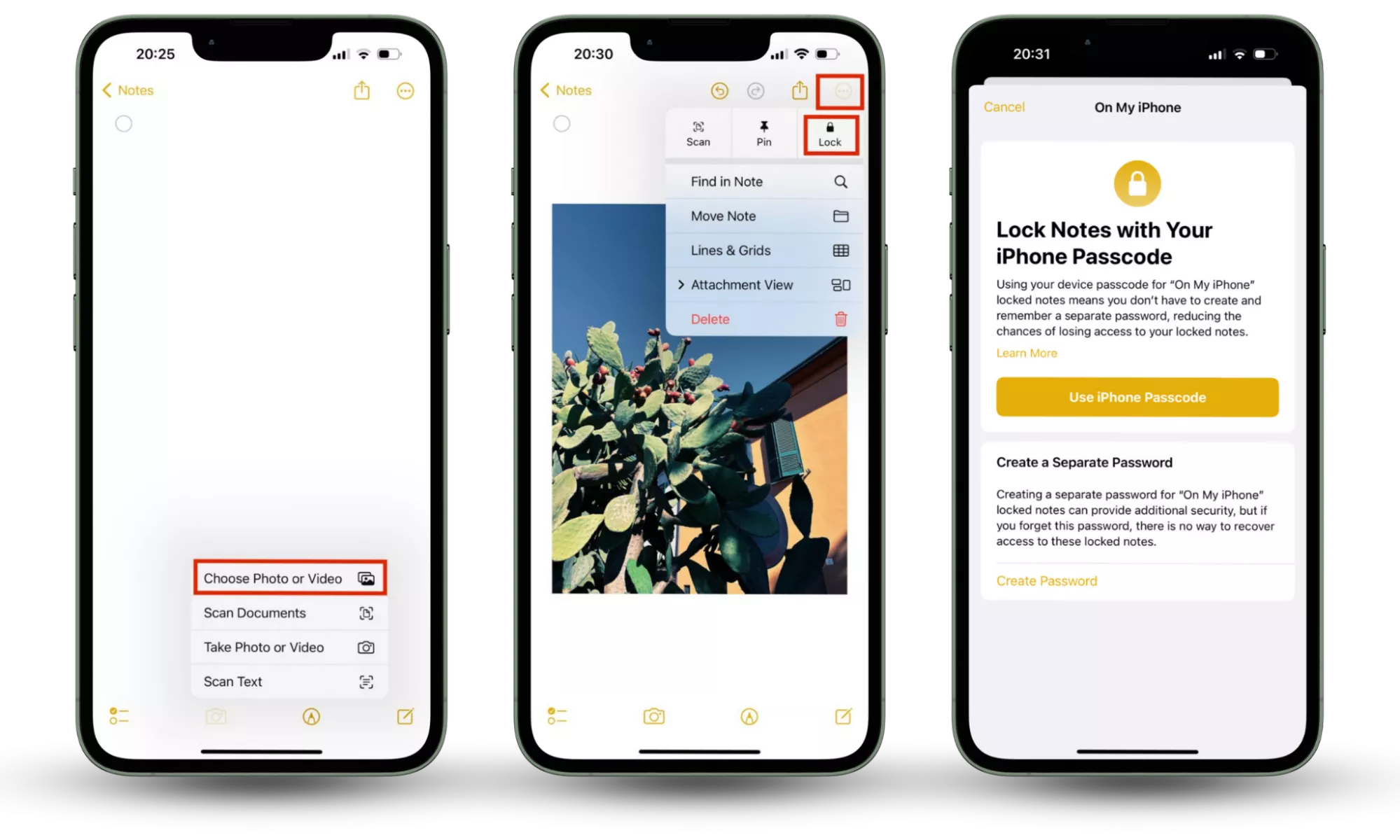 Adım 1-4. Notlar > Fotoğraf veya Video'yu seçin > Diğer (…) > iPhone Parolasını Kullan.