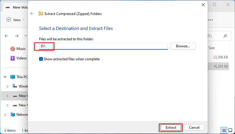 4. Sıkıştırma açma yolunu şu şekilde değiştirin: D: \ ve ardından “Çıkart”a tıklayın. Dosya açma işleminin tamamlanmasını bekleyin.