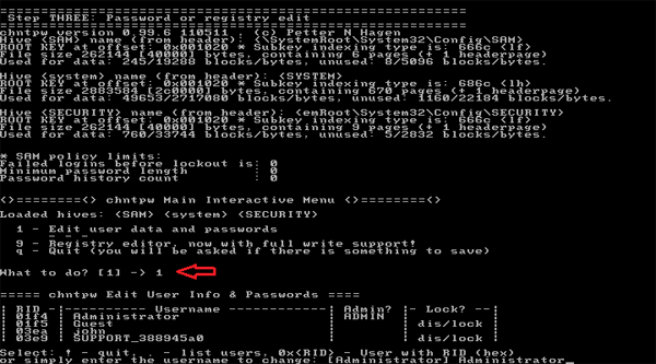 Kayıt defterinin hangi bölümünün yükleneceğini sorduğunda “1” yazıp Enter tuşuna basın. “chntpw Ana İnteraktif Menü” gösterildiğinde, “1” yazın ve “Kullanıcı verilerini ve şifrelerini düzenle” seçeneğini seçmek için Enter tuşuna basın.