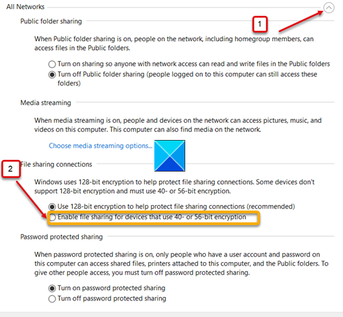 - Karşısında işaretlenen seçeneği işaretleyin40 veya 56 bit şifreleme kullanan cihazlar için dosya paylaşımını etkinleştirin.