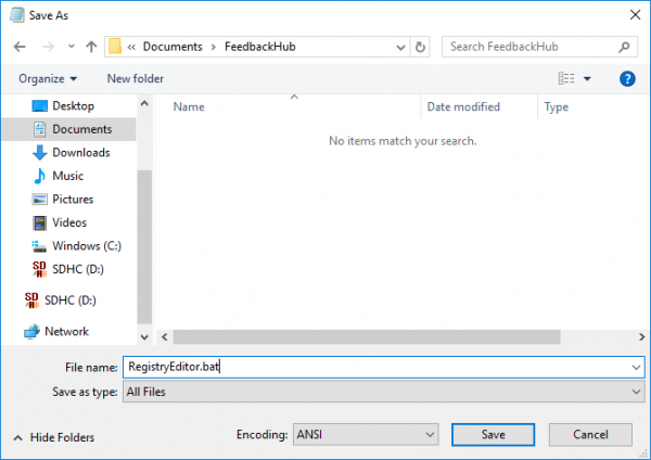 Alternatif yol, Kayıt Defteri Düzenleyicisi'ni açmanın kısayolu olarak bir BAT dosyası oluşturmaktır.
