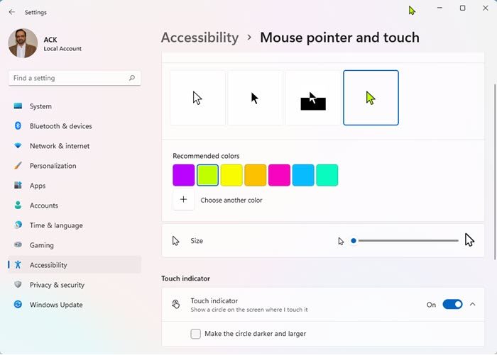 Dokunmatik ekranlı bir bilgisayarınız varsa Dokunmatik Göstergeyi değiştirebilir ve açabilirsiniz.Dokunduğumda ekranda bir daire görünüyor. Ayrıcadaireyi daha koyu ve daha büyük yapbu seçeneği seçerek.
