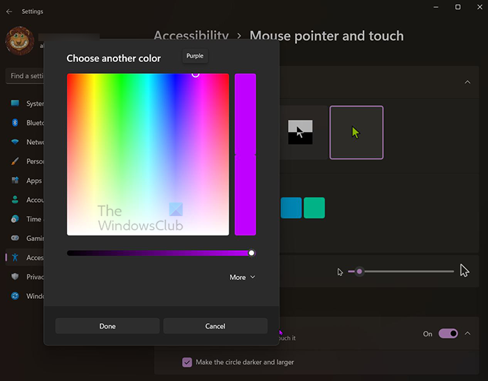 Windows 11'e özel imleçler eklemek için öncelikle Windows Ayarları panelini açmanız gerekir. Daha sonra şu adrese gidin:Erişilebilirlik > Fare işaretçisi ve dokunmaayar. Daha sonra gereksinimlerinize göre bir imleç seçebilirsiniz. Ancak yeni bir imleç yüklemek istiyorsanız işi tamamlamak için Denetim Masasını açmanız gerekir.