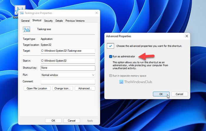 Bilgisayarınızda Masaüstü kısayolu oluşturup, Windows 11/10 PC'de kısayolu yönetici haklarıyla açmanız mümkündür. YapabilirsinGörev Yöneticisi için yönetici haklarını verin ve aşağıdakileri yapın:
