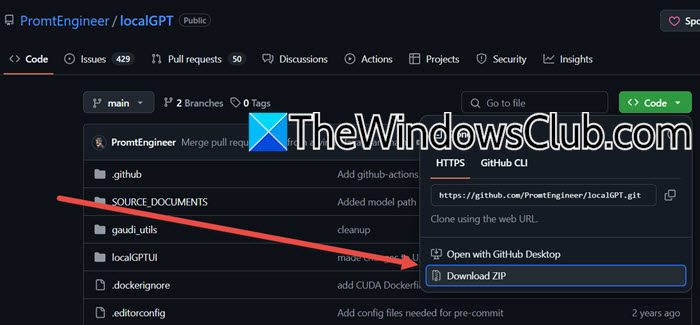 Şimdi GitHub'da Prompt Engineer tarafından barındırılan LocalGPT Deposunu kurmamız gerekiyor. Oradan alabiliriz. Bunu yapmak için şuraya gidin:github.com. LocalGPT hakkında daha fazla bilgi edinmek için sayfayı inceleyebilir ve yüklemek için üzerine tıklamanız yeterlidir.Kod > ZIP'i İndir'e tıklayın.ZIP dosyası indirildikten sonra şuraya gidin:İndirmekklasörünü açın, ZIP dosyasına sağ tıklayın, Çıkart'ı seçin, dosyayı çıkarmak istediğiniz konumu ayarlayın ve işlemi tamamlayın. Çıkarılan klasörü açın, içinde adında bir klasör göreceksiniz.LocalGPT-ana.Basitlik adına, klasörü Masaüstüne yapıştırıp adlandırıyoruz."LGPT".