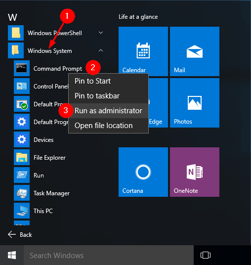 Прокрутіть униз і розгорнітьСистема Windowsви побачите папкуКомандний рядокярлик. Ви можете клацнути його, щоб запустити командний рядок у звичайному режимі, або клацнути правою кнопкою миші та вибрати «Запуск від імені адміністратора”, щоб запустити командний рядок у режимі адміністратора.