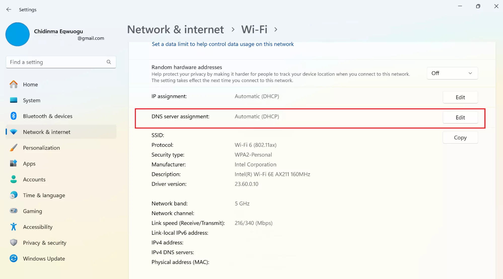 - Прокрутіть вниз і натиснітьРедагуватипідПризначення DNS-сервера.