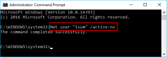 Щоб вимкнути обліковий запис користувача:Користувач мережі «Ім’я користувача» /active:no