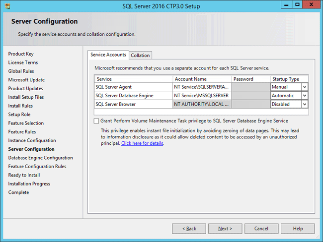 - На екрані конфігурації сервера ви можете вказати облікові записи служби та тип запуску або просто залишити конфігурацію за замовчуванням, оскільки ви можете змінити їх після встановлення.