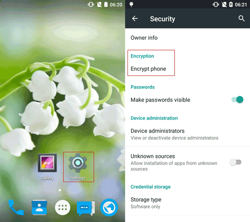 Крок 1: ВиберітьНалаштуванняБезпекана телефоні Android. ПідШифруванняваріант, торкнітьсяЗашифрувати телефон.