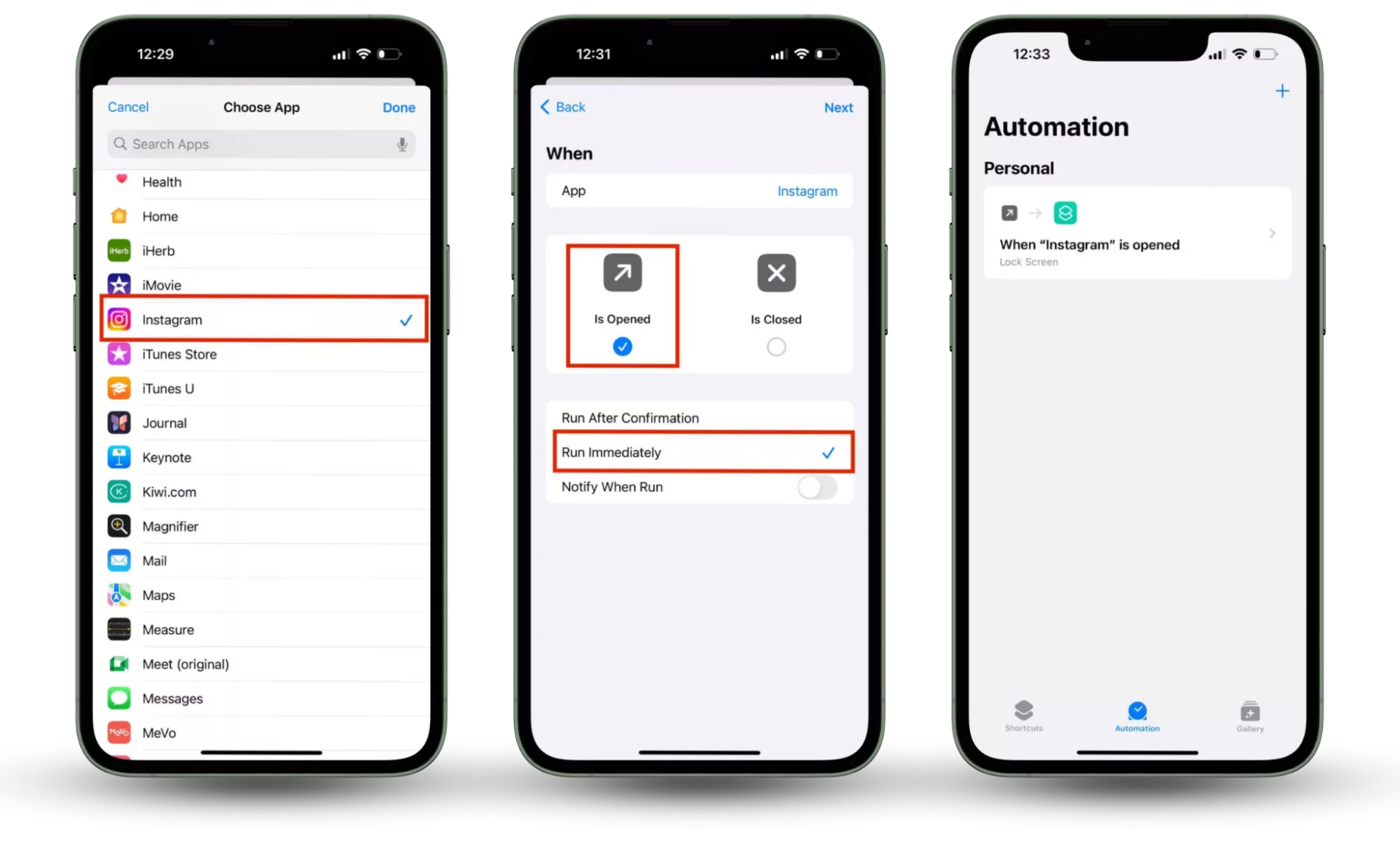 Кроки 5-7: Виберіть додаток > Відкрито > Запустити негайно > Далі.Відтепер, коли ви відкриваєте програму Instagram (або ту, яку ви вибрали), екран блокування активується автоматично. Перш ніж отримати доступ до програми, вам потрібно буде розблокувати iPhone як зазвичай — за допомогою Face ID, Touch ID або пароля.