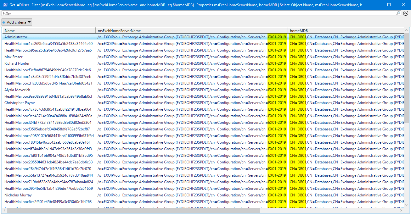 Не всі користувачі мають поштову скриньку, і вони можуть бути в різних базах даних. Тож давайте відфільтруємо лише користувачів з Exchange Server EX01-2019 і бази даних поштових скриньок DB01.
