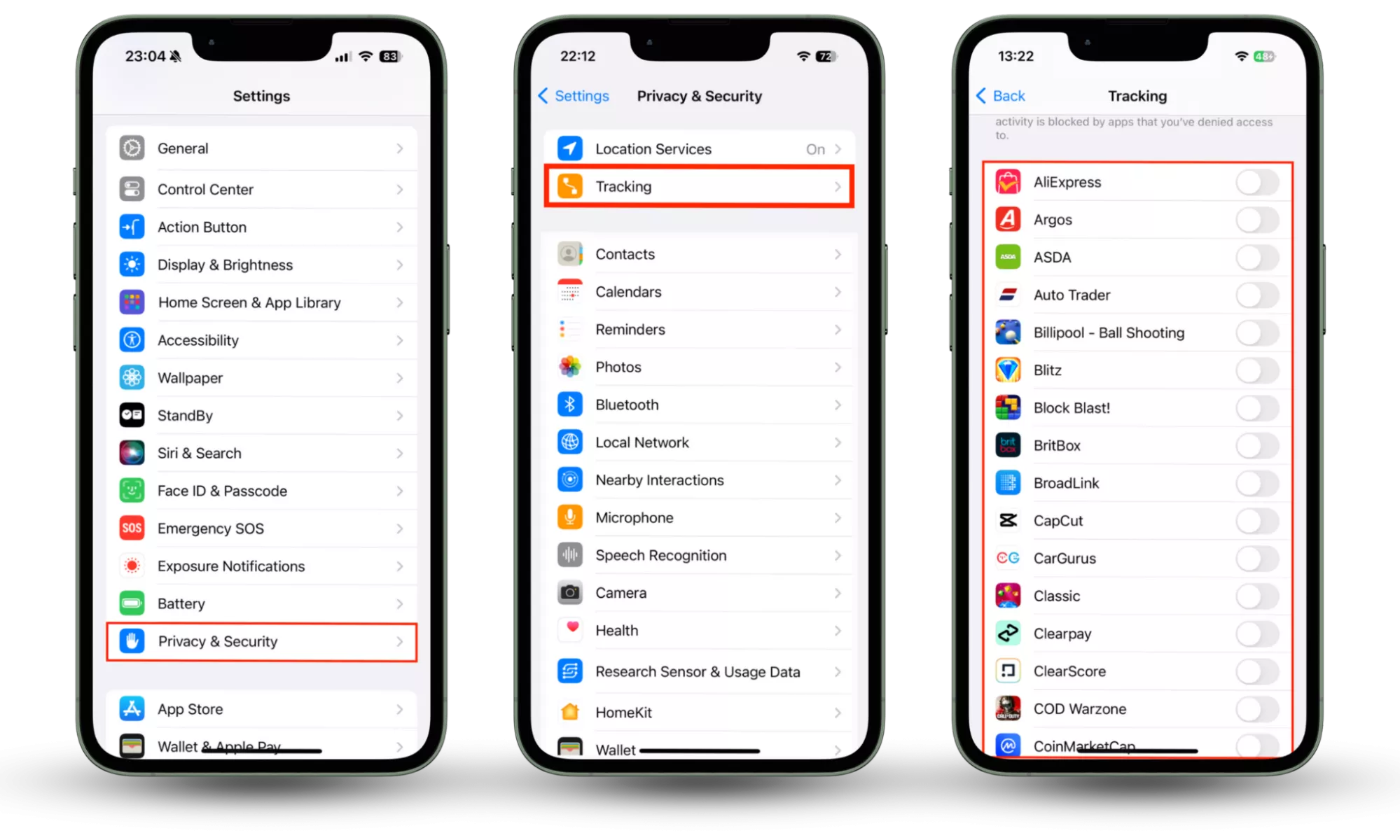 Крок 1-3: Налаштування > Конфіденційність і безпека > Відстеження. Вимкніть відстеження для всіх програм, яким воно не потрібне.Щоб зменшити кількість підказок дозволити відстеження програм у майбутньому, перейдіть доВідстеженнявКонфіденційність і безпекаменю, а потім вимкніть опцію дляДозволити програмам надсилати запити на відстеження. Це припинить усі майбутні запити про місцезнаходження під час встановлення нової програми, і ви зможете вручну надати доступ тим, кому довіряєте.
