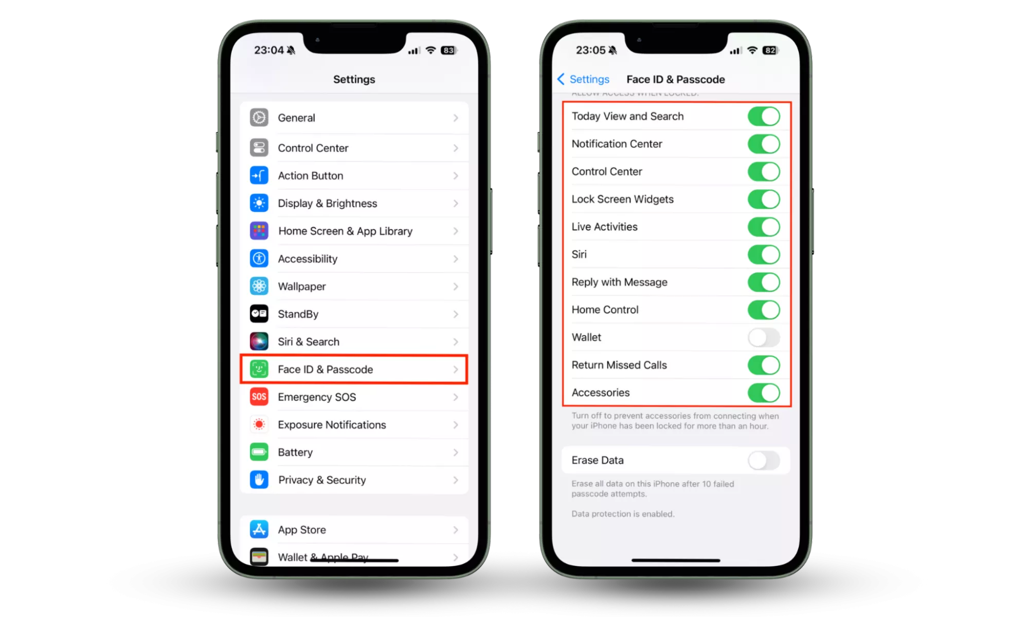 Крок 1-2: Налаштування > Ідентифікатор обличчя та пароль. Виберіть, які функції можна використовувати на екрані блокування.Ми рекомендуємо вам вимкнути всі параметри тут, щоб повністю захистити свій iPhone. Якщо ви не хочете заходити так далеко, вам слід принаймні вимкнути такі функції: