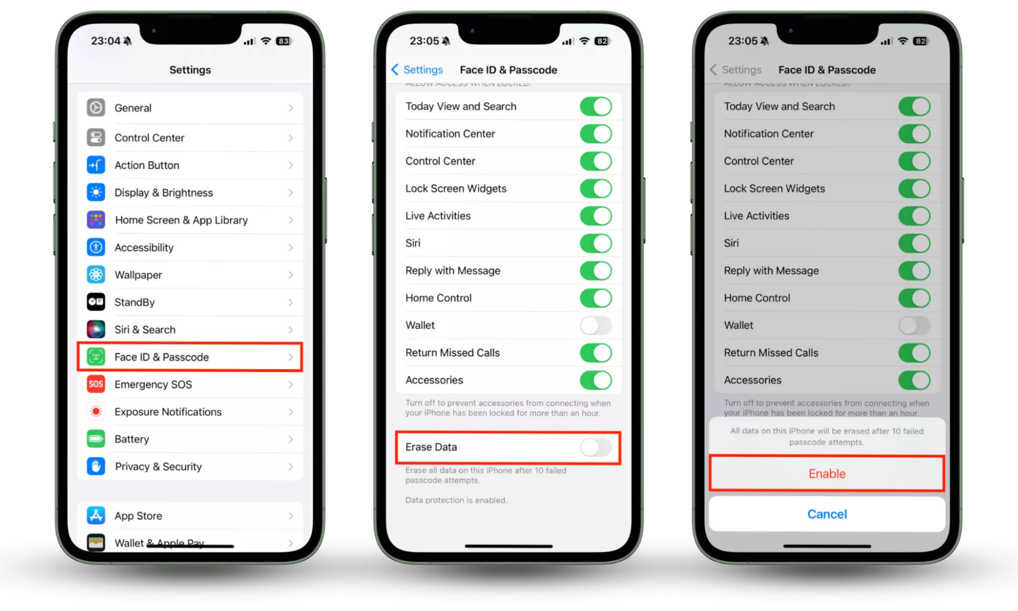 Крок 1-3: у налаштуваннях виберіть Face ID & Passcode, увімкніть опцію «Стерти дані».Примітка