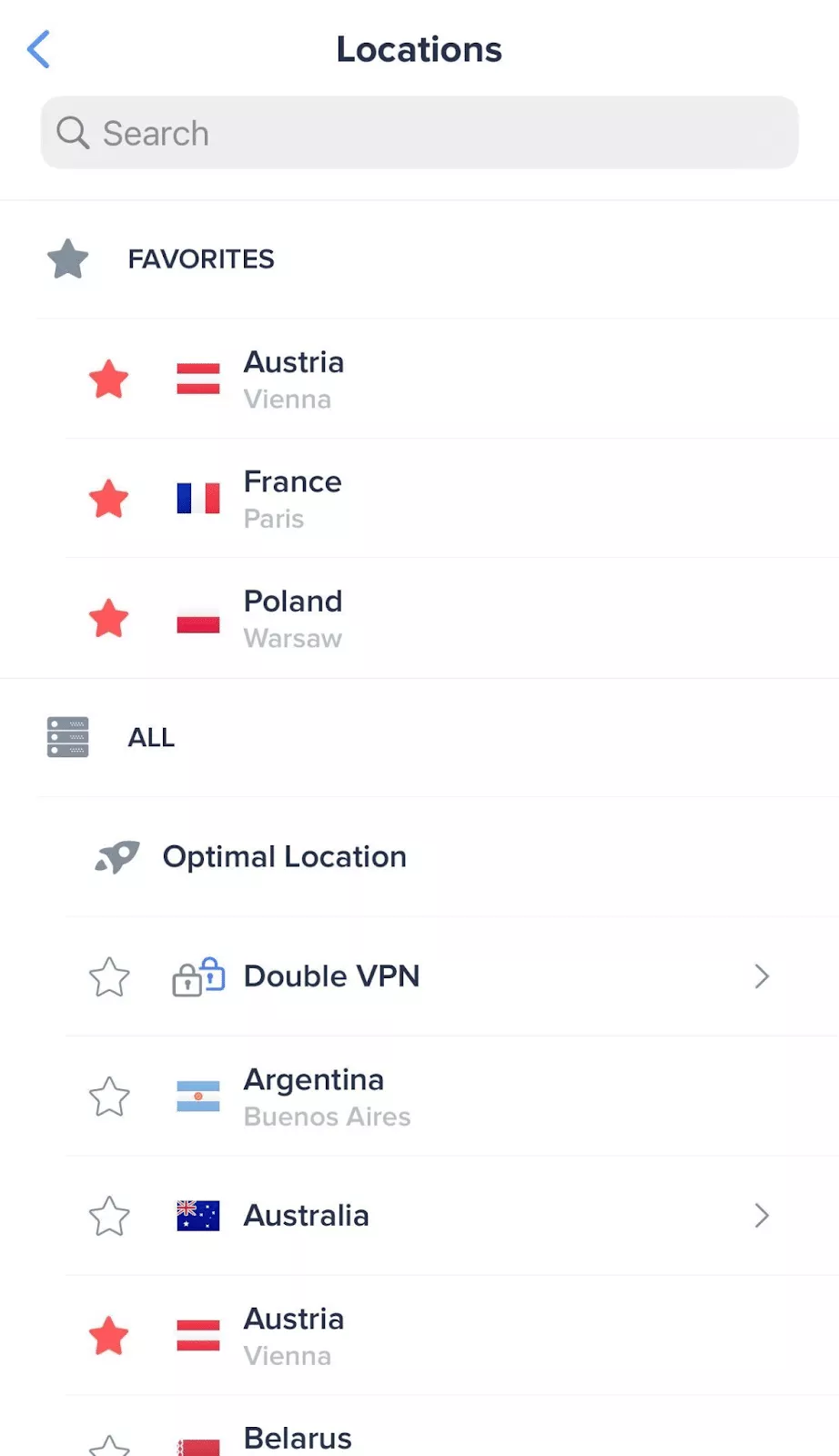 - Ви також можете додати бажані сервери та країни до вибраного, а також підключитися до aПодвійний VPNдля подвійної безпеки.