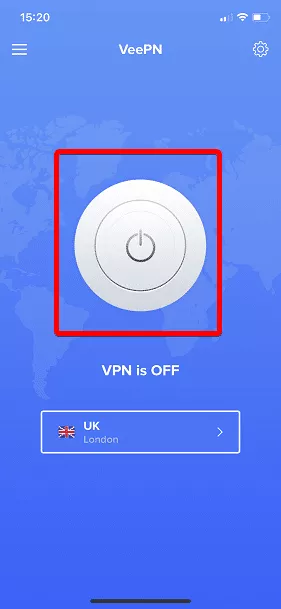 - Торкніться великої кнопки ON посередині екрана.Це може зайняти кілька хвилин залежно від розташування та завантаження сервера. Щоб від’єднатися, натисніть кнопку ще раз.