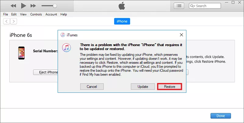 крок 3:Запустіть iTunes, після чого з’явиться спливаюче вікно із запитом Оновити або Відновити. Виберіть