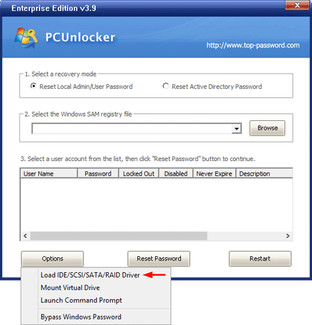 - Дочекайтеся запуску програми PCUnlocker. Програма може запропонувати вам вибрати файл SAM, оскільки вона не може розпізнати ваш жорсткий диск. Тож вам доведеться завантажувати драйвер RAID на льоту. Натисніть наОпціївнизу екрана, а потім виберіть «Завантажте драйвер IDE/SCSI/SATA/RAID“.