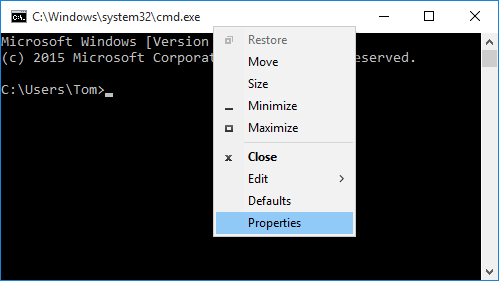 Відкрийте командний рядок. Клацніть правою кнопкою миші рядок заголовка та виберітьВластивостіз контекстного меню, що відкривається..