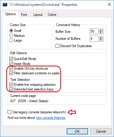 Якщо ви хочете використовувати стару застарілу версію командного рядка, просто зніміть прапорець «Використовувати застарілу консоль (потрібно перезапустити)". Коли застарілу консоль увімкнено, доступні лише два параметри редагування: режим швидкого редагування, режим вставки. Щоб отримати доступ до інших параметрів редагування, таких як "Увімкнути нові комбінації клавіш Ctrl", вам потрібно ввімкнути нову консоль, знявши прапорець "Використовувати застарілу консоль (потрібно перезапустити)”.