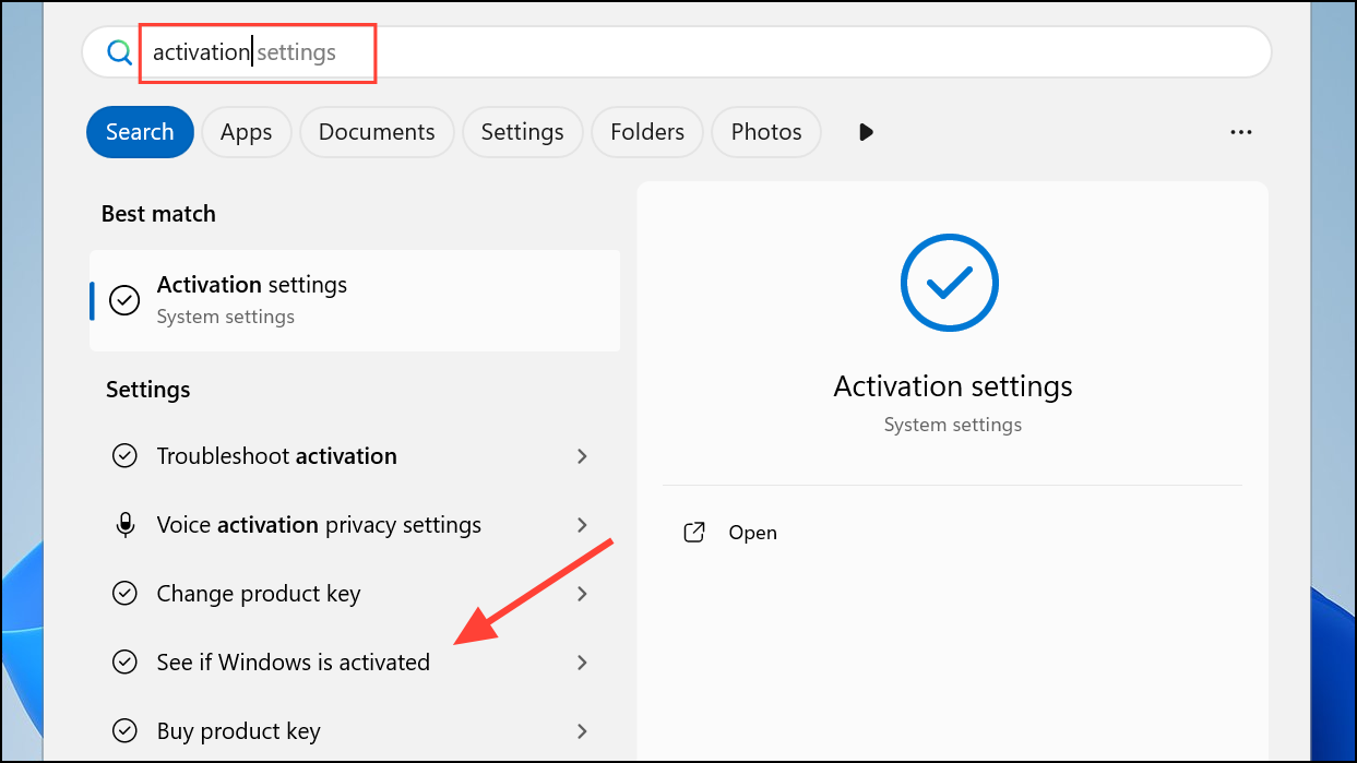 крок 1:На панелі завдань Windows введітьActivationу вікні пошуку та виберітьSee if Windows is activatedвід результатів.